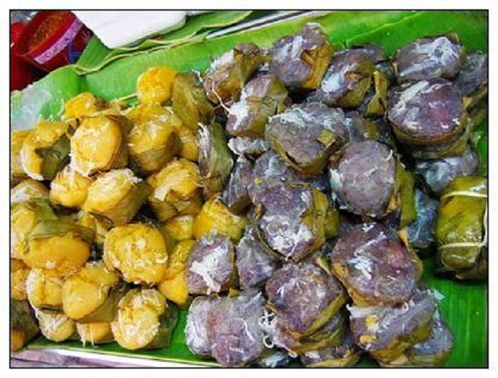 泰國人包裹的粽子,個頭小如雞蛋,因為是用綠色粽葉包裹,所以,蒸熟后呈淡綠色,味道十分清香。
