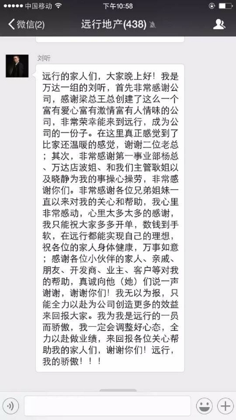 遠行,這兩個字是什么意義?是公司名稱?是;是一群追夢人的代名詞?也沒錯;是溫暖的一個家?的確;或許還有很多的理由,還有很多的解釋。但是我想總有一個理由是叫做“執(zhí)著”,是你想越行越遠,越站越高的執(zhí)著,是想忘卻舊時光的你走向新世界的執(zhí)著,是想讓遠方的親人妻兒安穩(wěn)生活的自我執(zhí)著,還有你不甘于平庸,憤然而起的生活態(tài)度的執(zhí)著。企業(yè)文化是遠行的靈魂,我們是遠行的新鮮血液。但遠行,同樣也是我們的靈魂,遠行人亦是我們的血液。衷心希望萬達店劉聽可以用最好的心態(tài)去面對生活中的磨難,每位遠行人,都愿意陪你一路同行。——建外西區(qū)店 張志彬