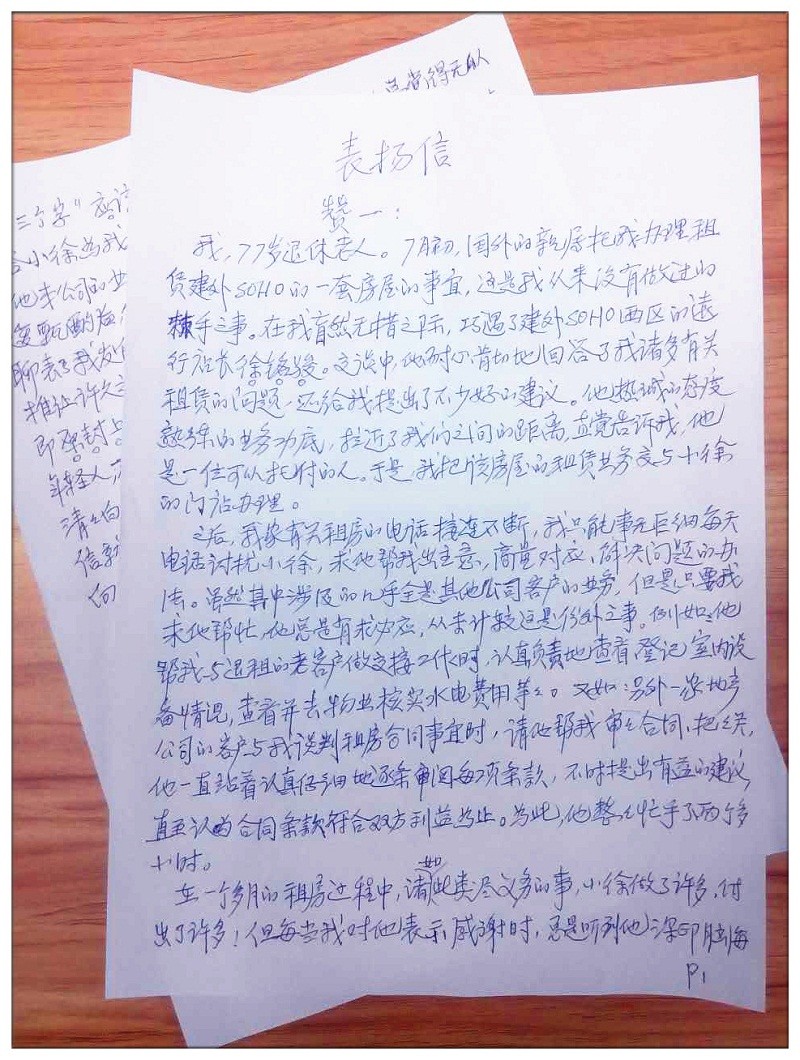在一個多月的租房過程中,諸如此類盡義務的事,小徐做了許多,付出了許多!但每當我對他表示感謝時,總是聽到他深印腦海中的三個字“應該的”。對此,除了感佩不已,總覺得無從報答小徐為我所做的一切,考慮到小徐為我做的事情與他本公司的業務沒有任何交集,純粹是私人之間的幫忙。我反復斟酌后,拿了5千元準備給他,既不是什么違法行為,也聊表了我發自內心的感激之情。誰成想到他卻堅辭拒收,推讓許久之后,他無奈我年高、堅持,暫將錢收了下來。他一回去即原封上交了領導,并由領導退還給我。我驚嘆于小徐這樣的年輕人,在商海中游泳,卻能滴水不沾、嚴守法紀、一塵不染,清清白白做人做事,真是難能可貴啊!我給您的領導寫這封信就是由衷地為這位優秀青年點個贊!希望大家(包括我在內)向他學習。