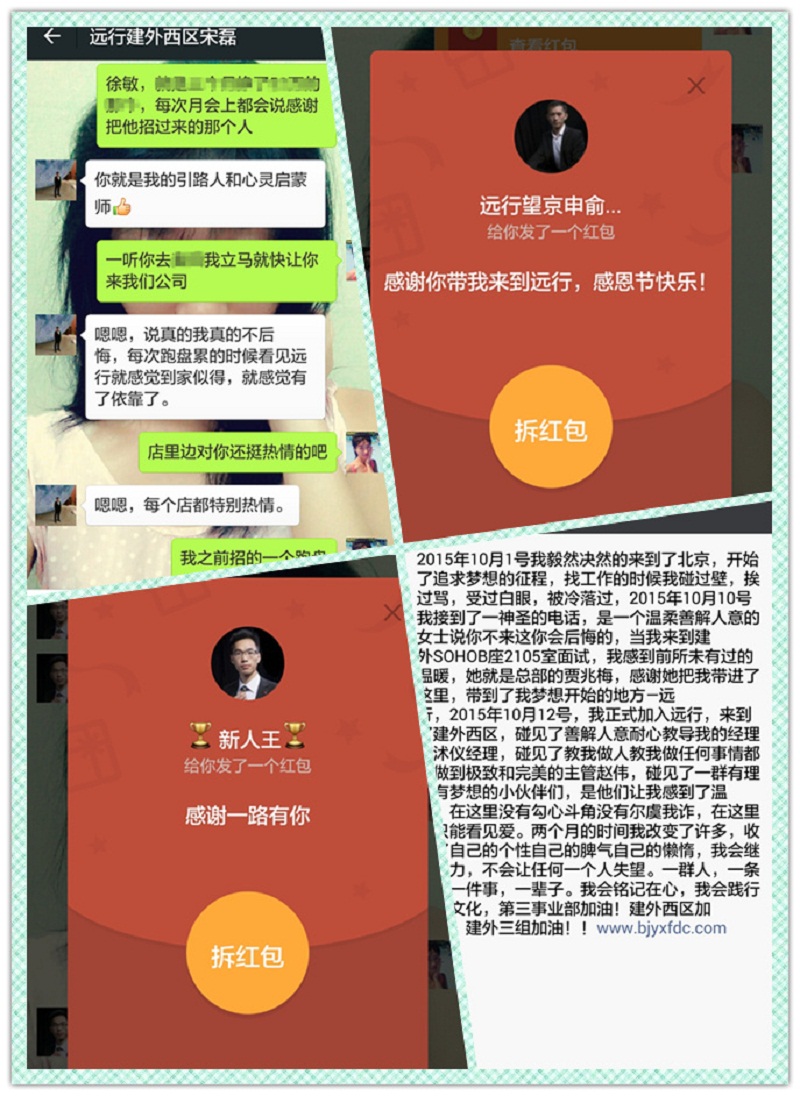 賈兆梅:我想分享兩點,第一就是公司的核心企業(yè)文化“團結(jié)、感恩、創(chuàng)造、分享”。公司將團結(jié)放在第一位,每個人都會互幫互助,大家之間沒有勾心斗角,都懂得感恩,大家一起沖著目標努力,共同創(chuàng)造,共同分享,整個公司形成了一個良好的氛圍;第二就是我們的領(lǐng)導(dǎo)很貼心,不官僚。記得我第一天來公司上班,當天人事部約到量比較高,婁總得知后直接就請客買冰淇淋犒勞我們。還有一次,我參加大興亦莊的月會,回去的時候搭了王總的順風車,本來計劃乘坐王總的車到大興的地鐵口就下車,可王總詢問我的住址發(fā)現(xiàn)順路之后就直接把我送到了家門口。這些事對我的觸動很大,我們的老總真的很關(guān)心員工,并且我們的老總也必須帶工牌、領(lǐng)帶和司徽,不帶也會被罰錢。這些都是發(fā)生在我身邊的真實的事,它讓我體會到了遠行平臺的珍貴與強大!